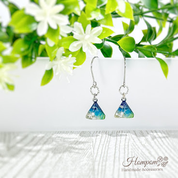 琉球ガラスの破片を集めてドゥルージーのようなピアスを作りました。